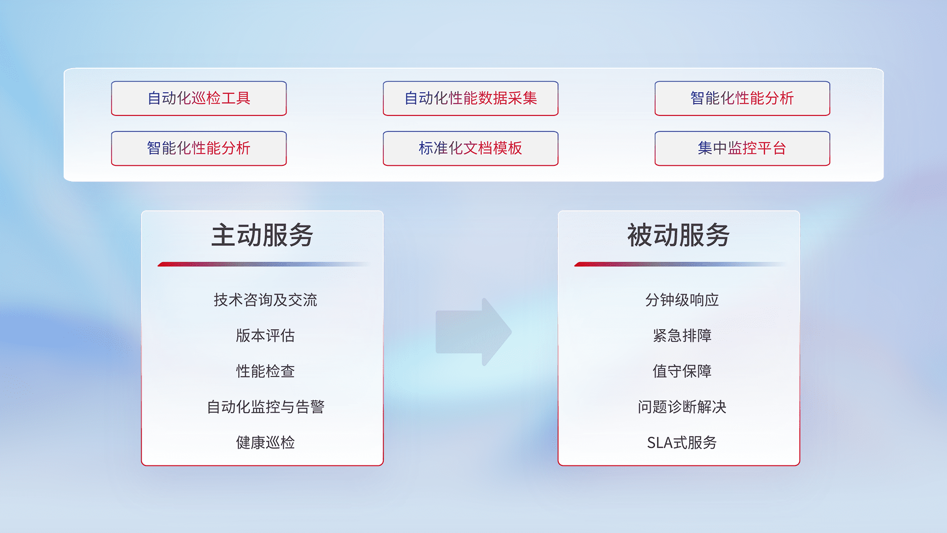 智能化工具和标准化文档,,,保障服务质量,,,,提供主动服务(包含技术咨询、、、版本评估、、、性能检查、、、自动化监控与告警、、健康巡检)和被动服务包含(分钟级响应、、、紧急排障、、、值守保障、、、问题诊断解决、、、SLA服务)。。